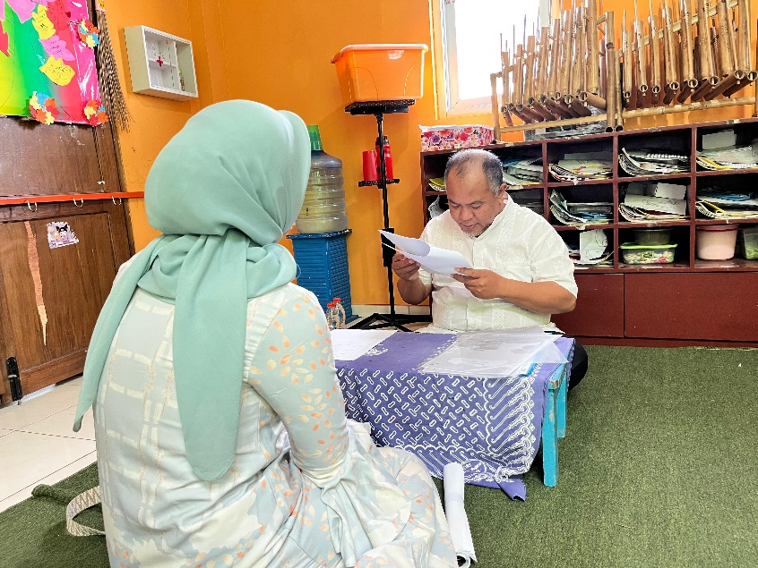 Santri melakukan tes bilqolam untuk menilai kemampuan membaca dan mengenal huruf hijaiyah.